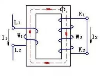 電流互感器由一次線圈、二次線圈、鐵心、絕緣支撐及出線端子等組成。電流互感器的鐵心由硅鋼片疊制而成,其一次線圈與主電路串聯(lián),且經(jīng)過被測電流I1,它在鐵心內(nèi)發(fā)生交變磁通,使二次線圈感應出相應的二次電流I2。如將勵磁損耗忽略不計,則I1n1=I2n2,其間n1和n2分別為一、二次線圈的匝數(shù)。電流互感器的變流比K=I1/I2=n2/n1。